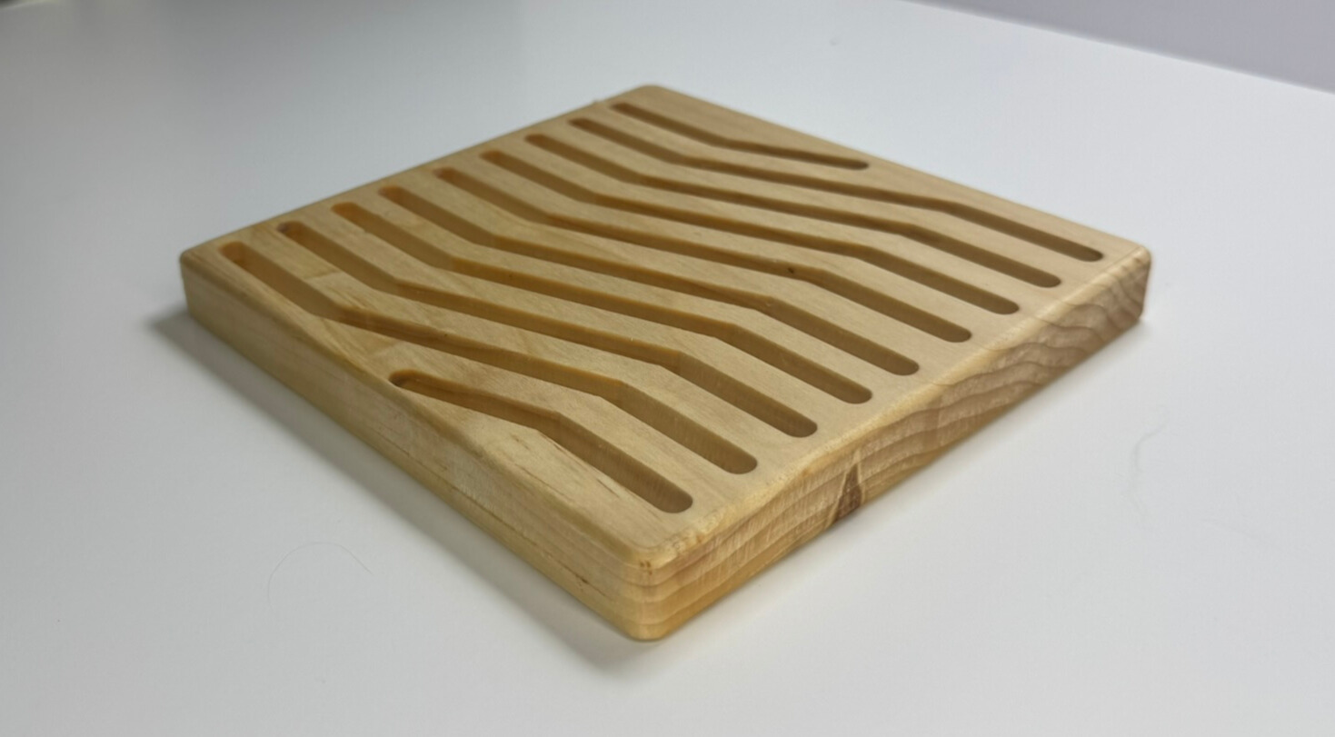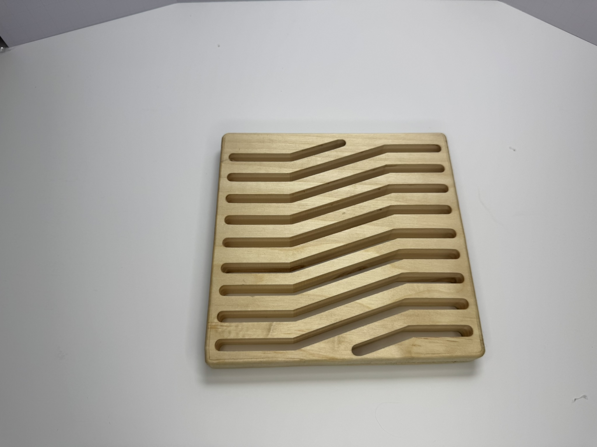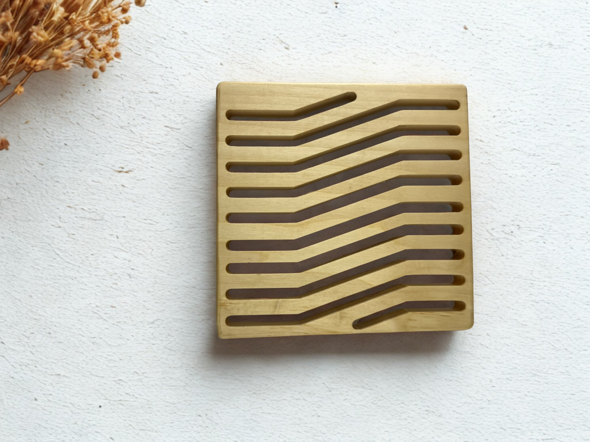 This square trivet is a stylish and functional addition to any kitchen or dining area. Made from high-quality wood, it features a zigzag slot design that not only add a touch of elegance but also serve a practical purpose.